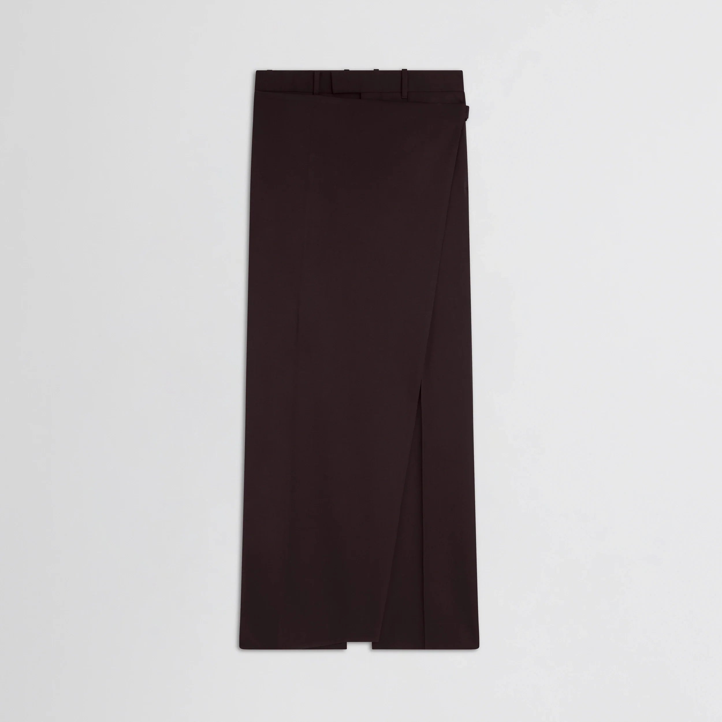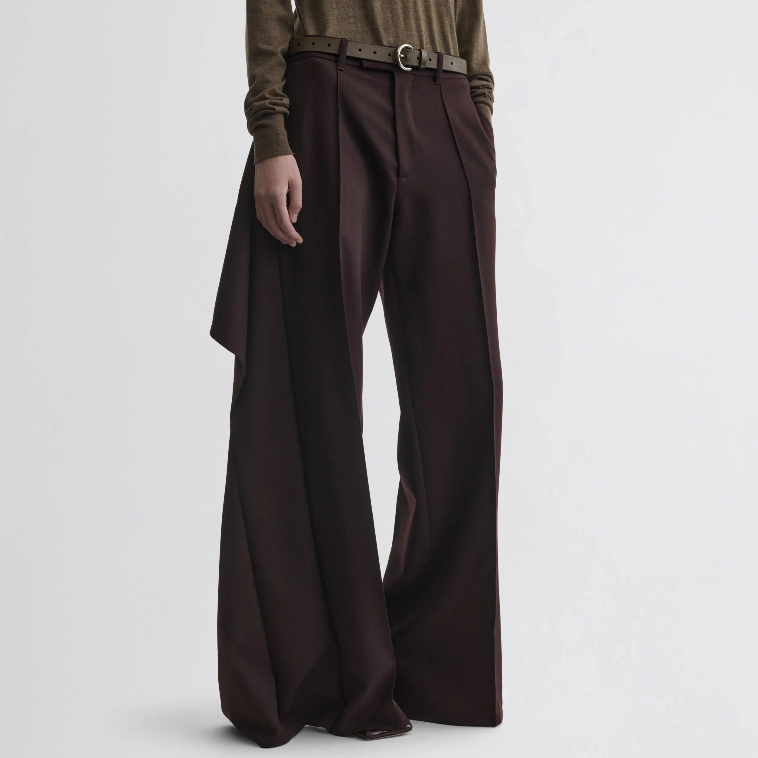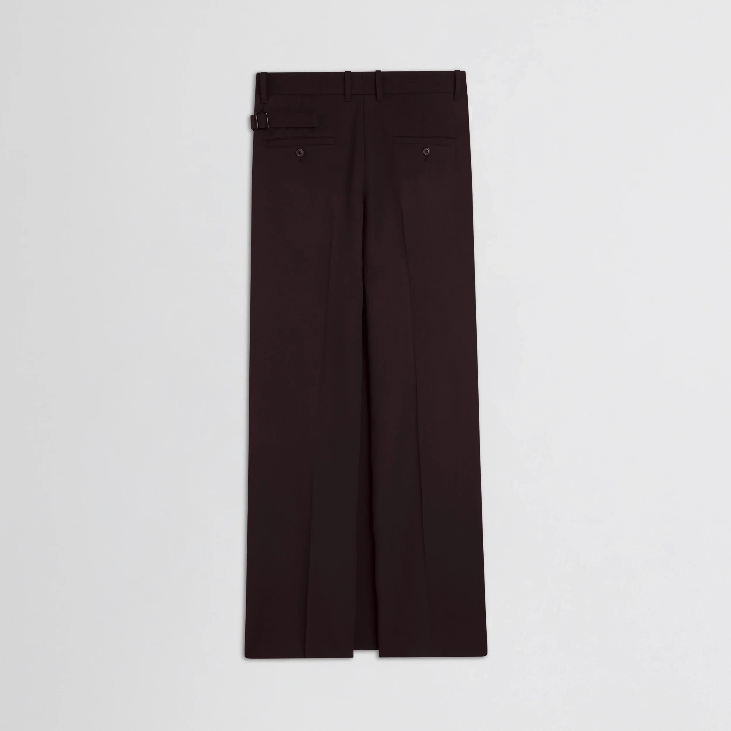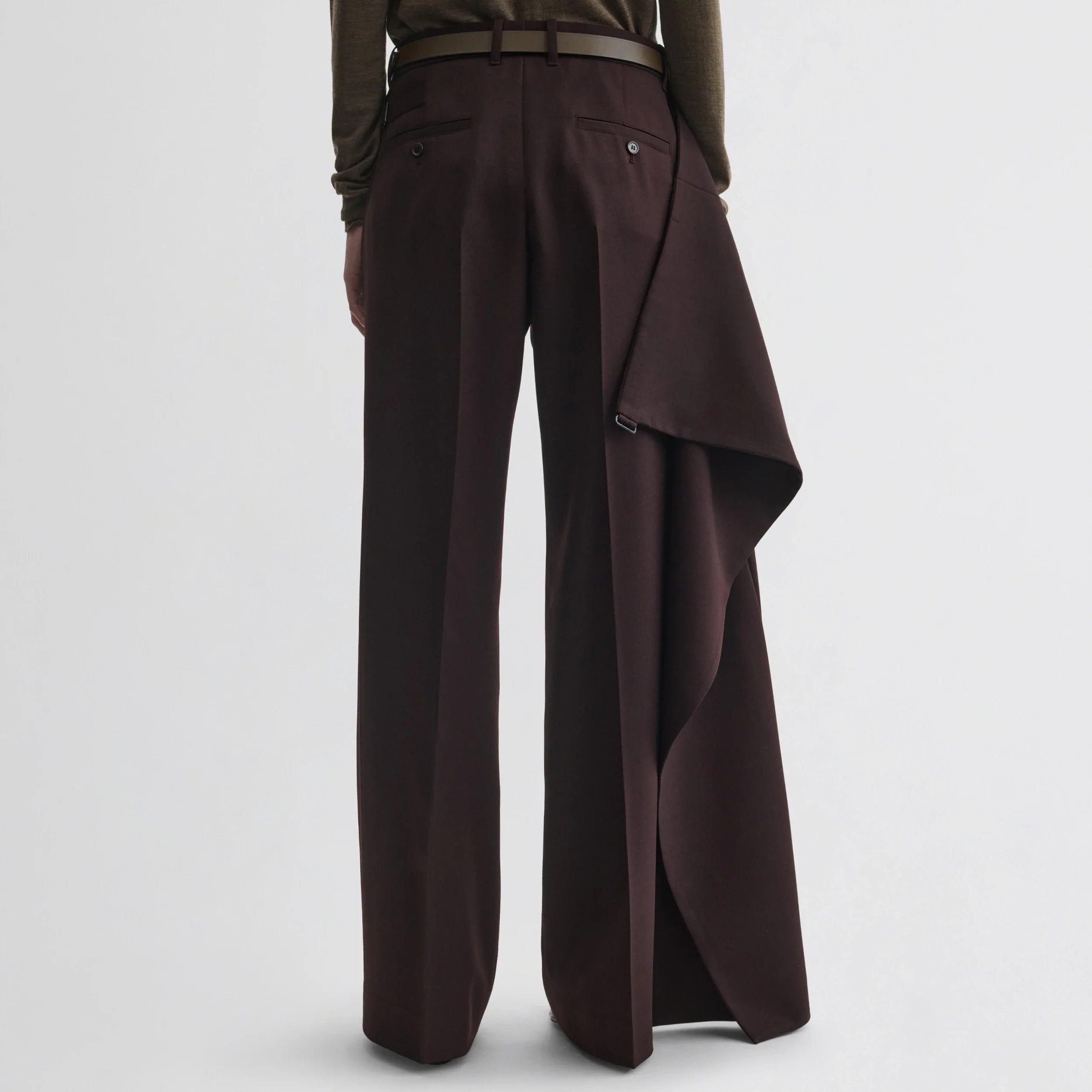 Apron trousers in chocolate wool. A draped panel is attached to the side seam and can be fastened across the front via a bar strap, mimicking the look of a skirt; alternatively, it can be worn loose and let to drape naturally. The trousers have an easy fit with a mid-rise waist and straight leg.
