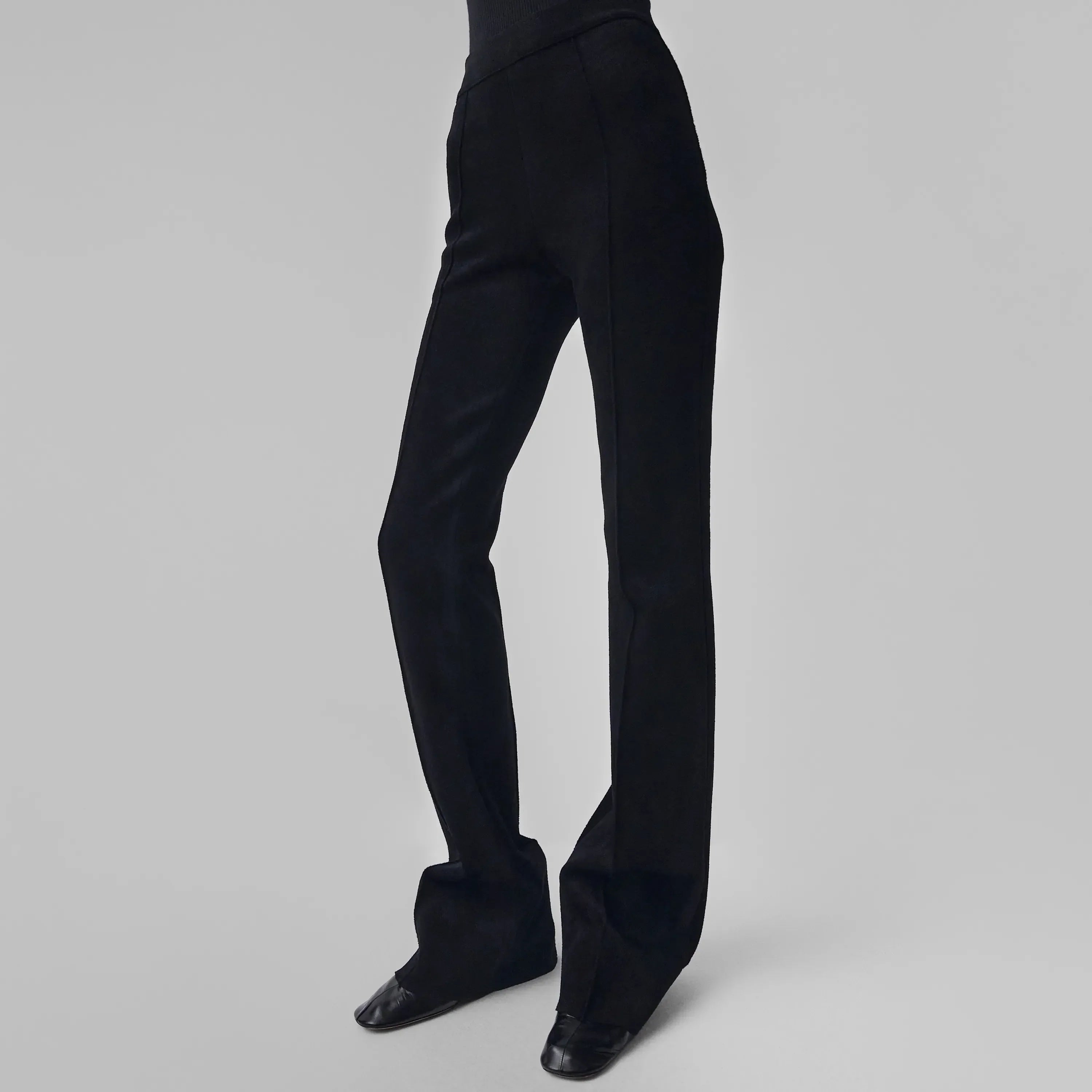 Trousers with a high waist in black weighted knit double-face chenille technical polyester. The trousers have a side zip fastening, pin-tuck seams, fit close to the hips and flare from the knee.