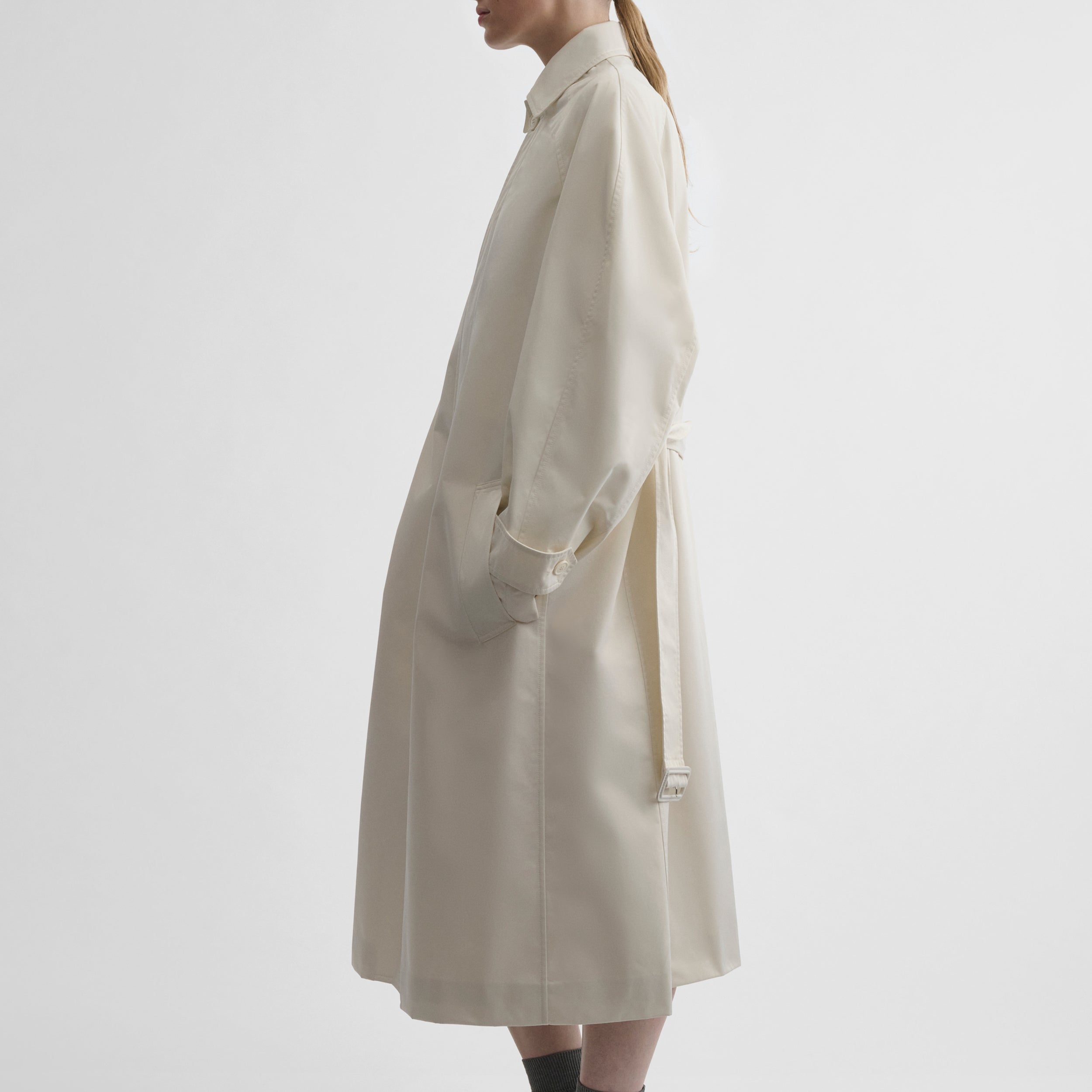 Car coat in ivory technical twill. Designed for an oversized fit, the belted coat has side pockets, two button-fastening interior pockets, and a covered button placket with a single exposed button at the neck. The fabric is water-resistant.