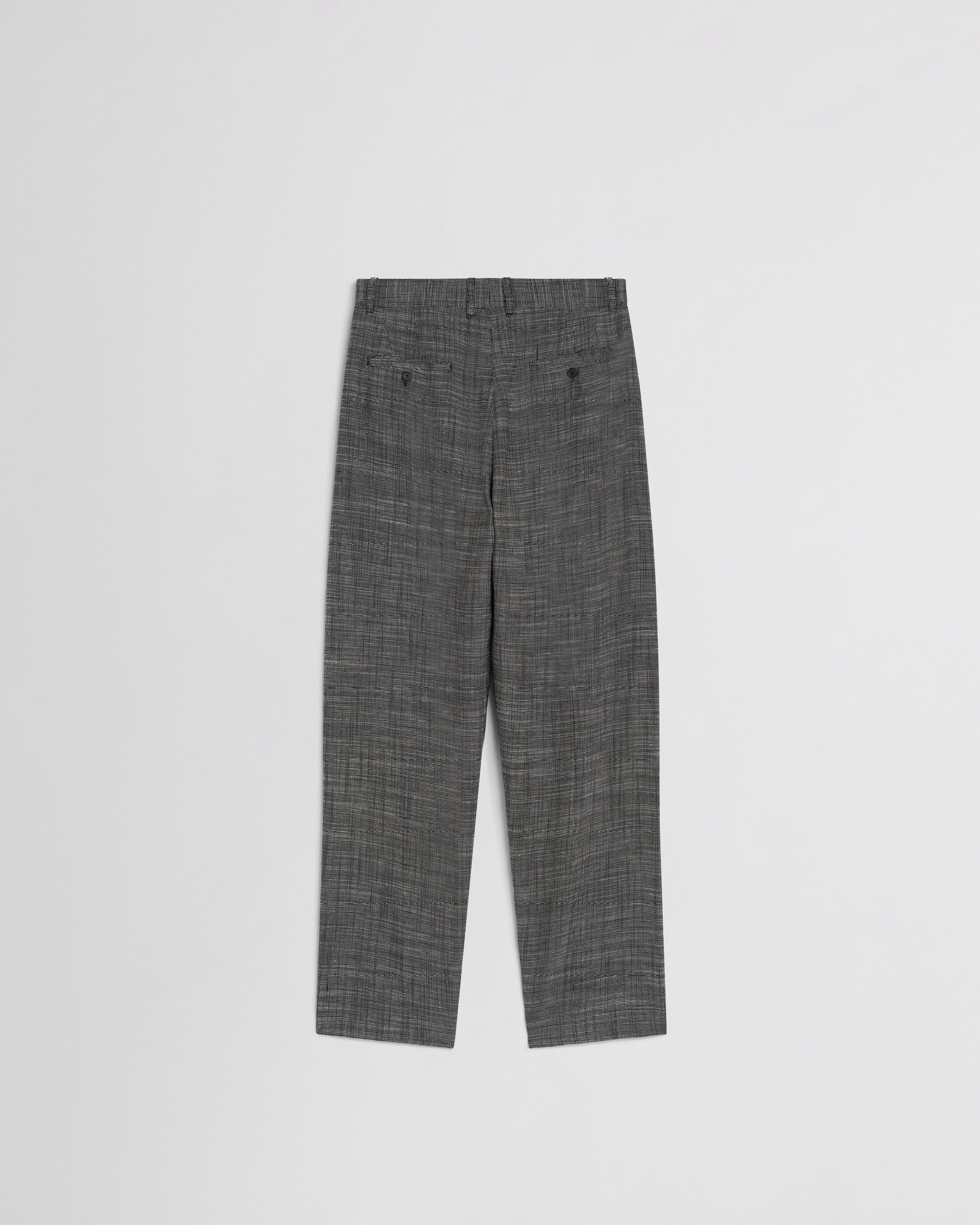 Tailored trousers in blue grey melange silk linen. The trousers have a men’s suiting touch: an eased fit, a wide leg, ride low on the hips and pool at the ankles. Unlined.