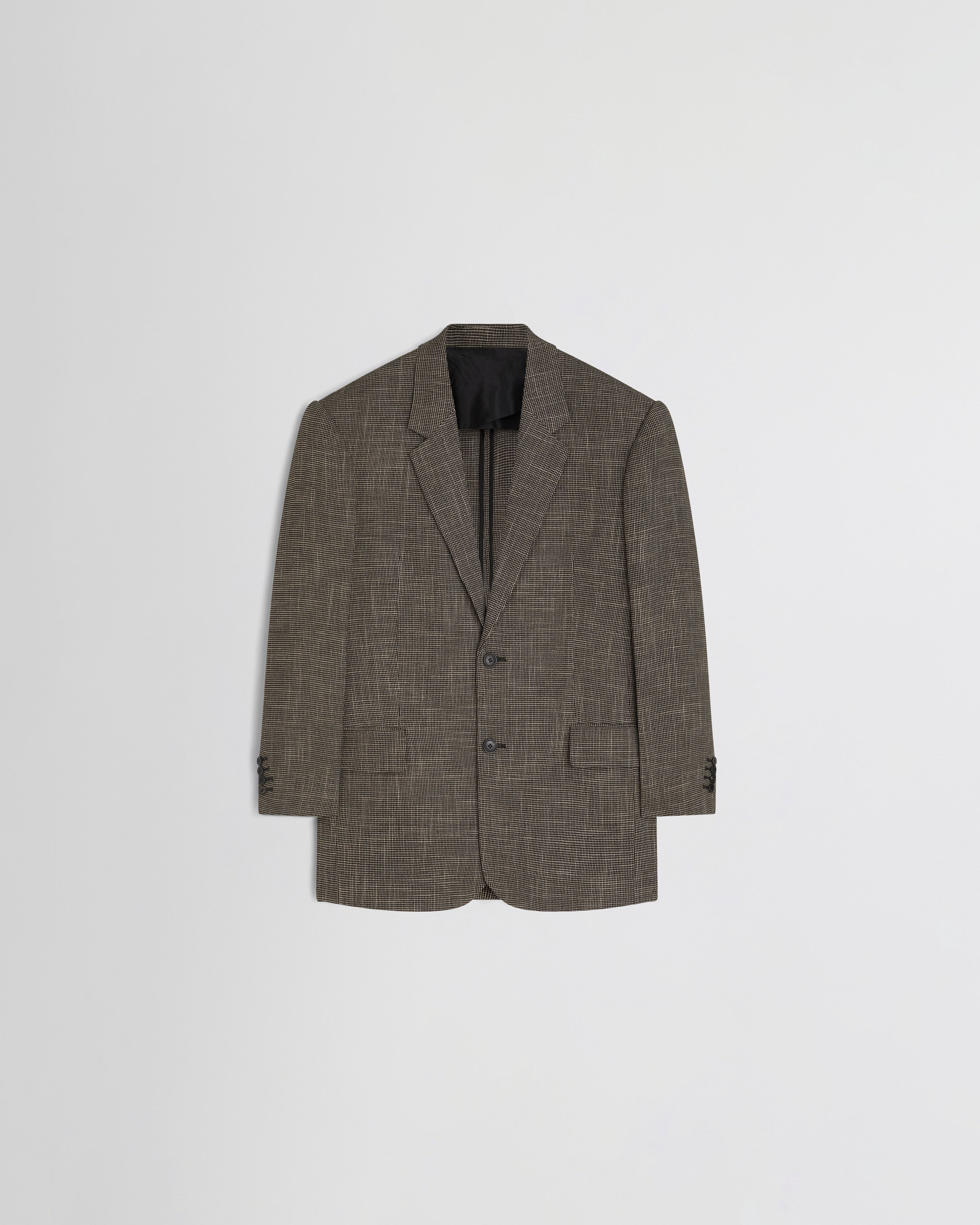 Fluid tailored jacket in salt and pepper woven viscose. Cut for a relaxed fit, the ease is amplified by the airy, textured open weave fabric. Lightly padded shoulders, button cuffs and flap pockets. Pressed for a clean finish, with a quarter lining and bound seams
