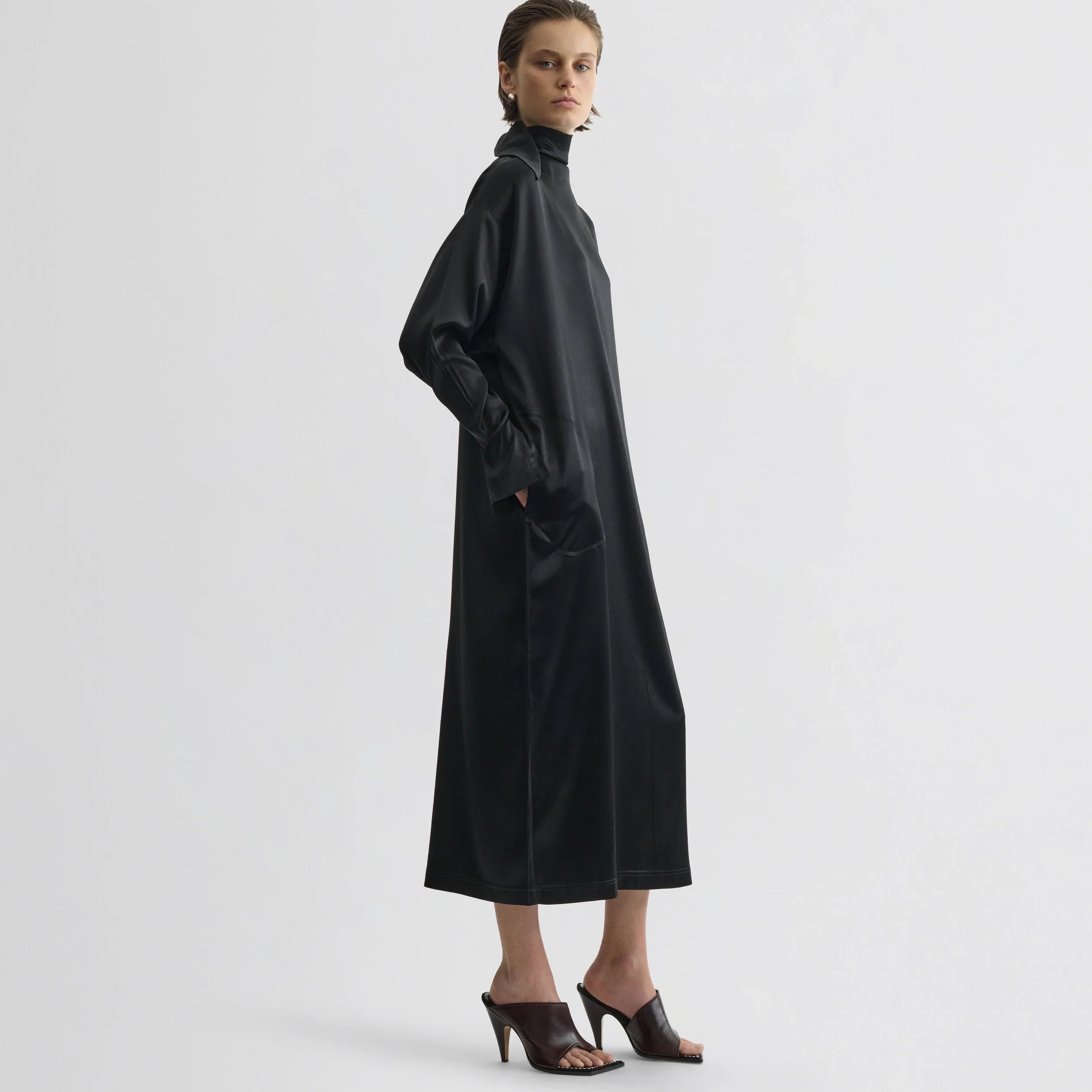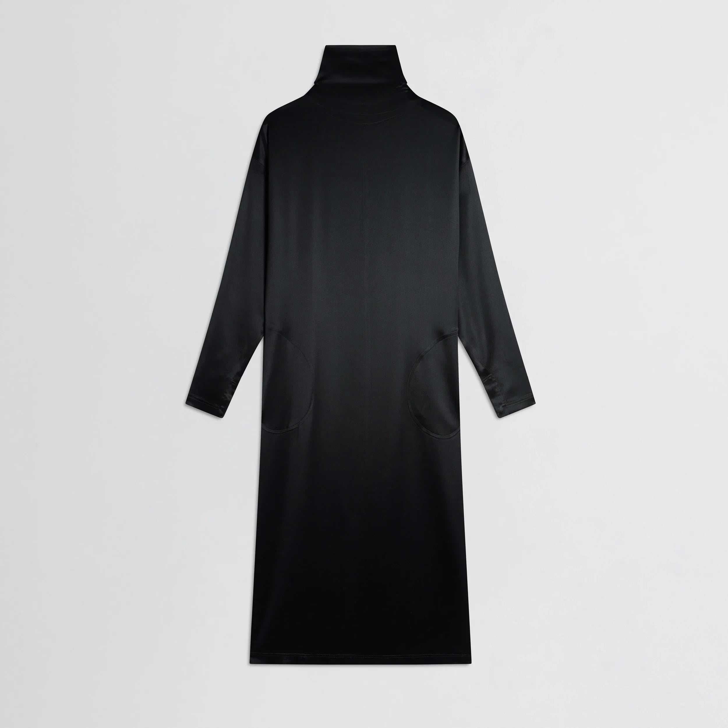 Liquid high neck dress in black stretch silk satin. Eased fit in the body, sleeves that narrow at the wrist and pockets at the sides. Centre back zip fastening and tie at the neck.