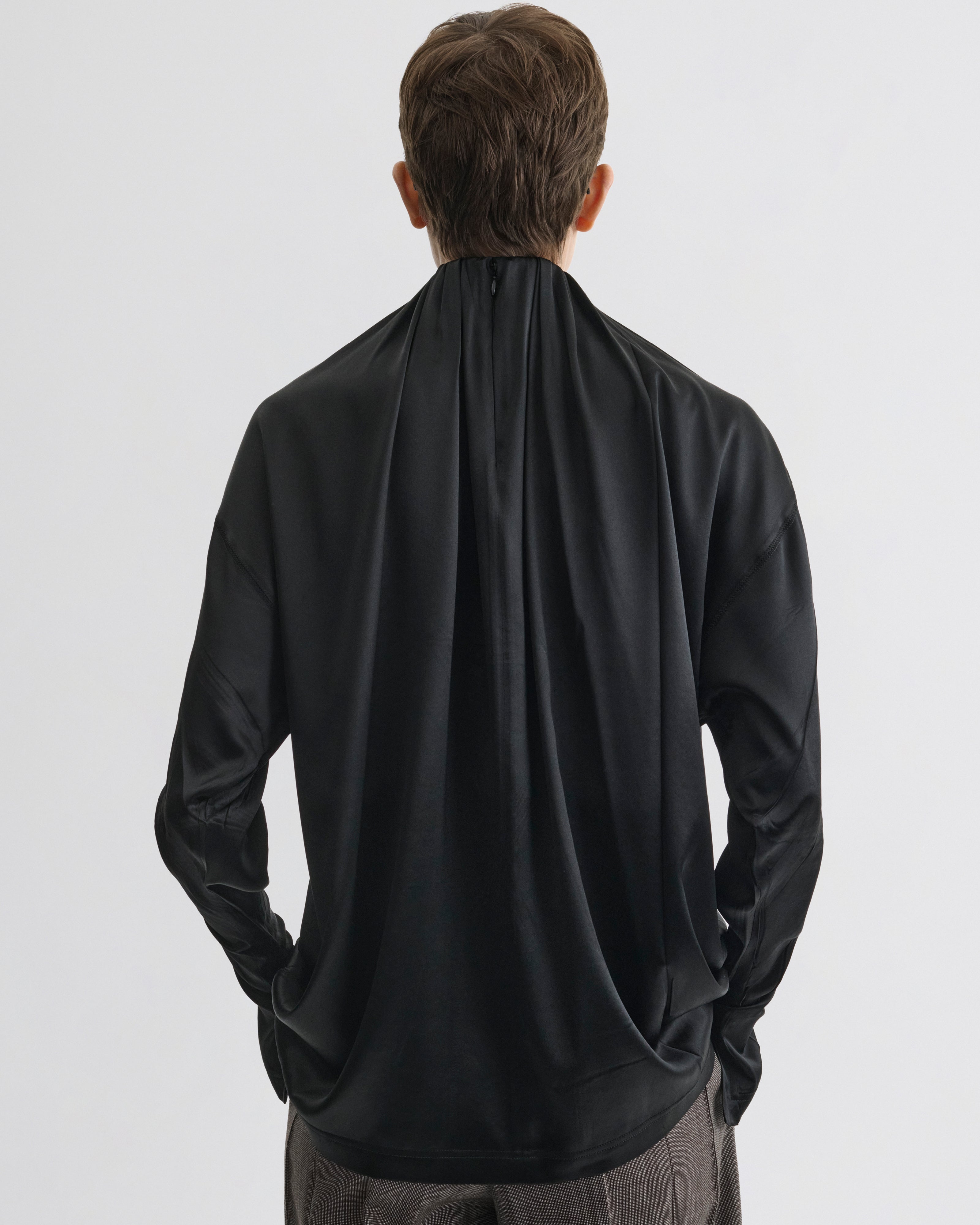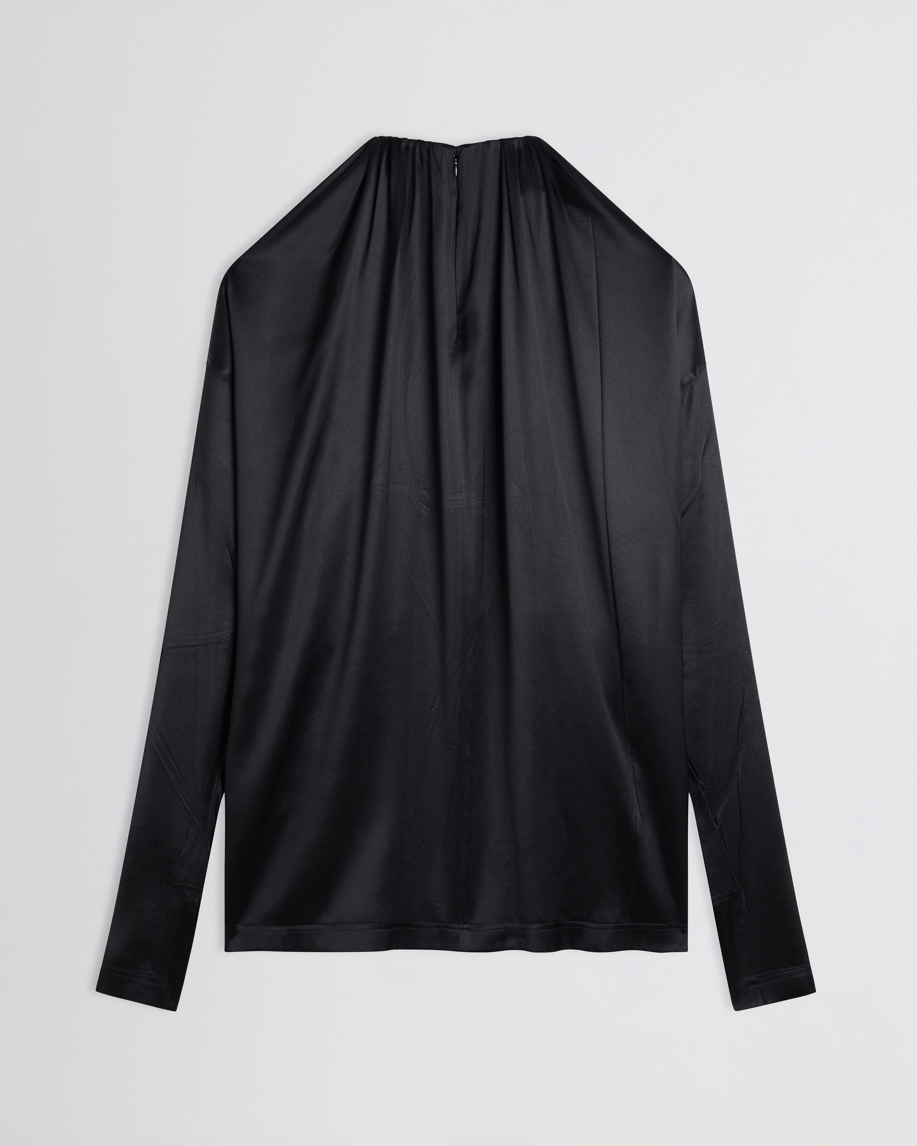 Liquid top in black silk satin. The glossy stretch fabric is gathered from the body to the neck in soft ridges to give a sculptural silhouette. Zip fastening at the back.