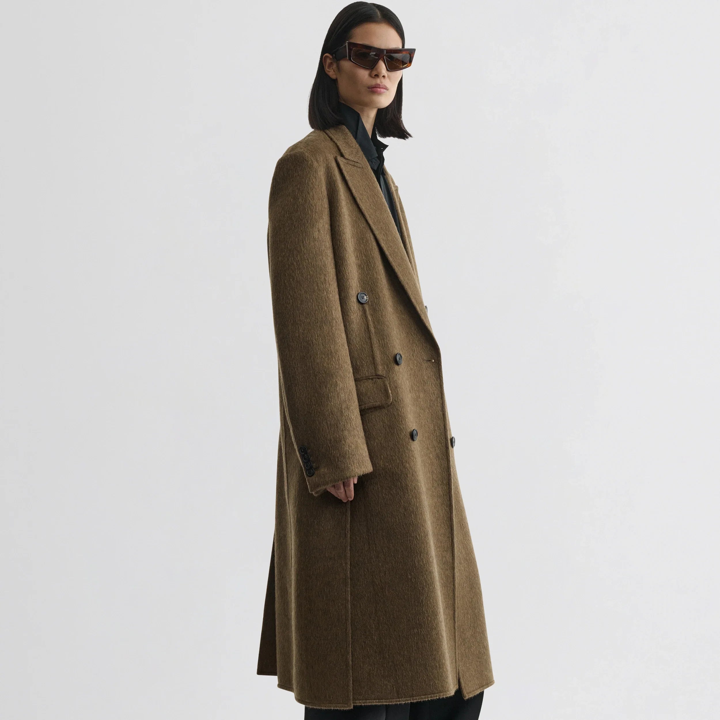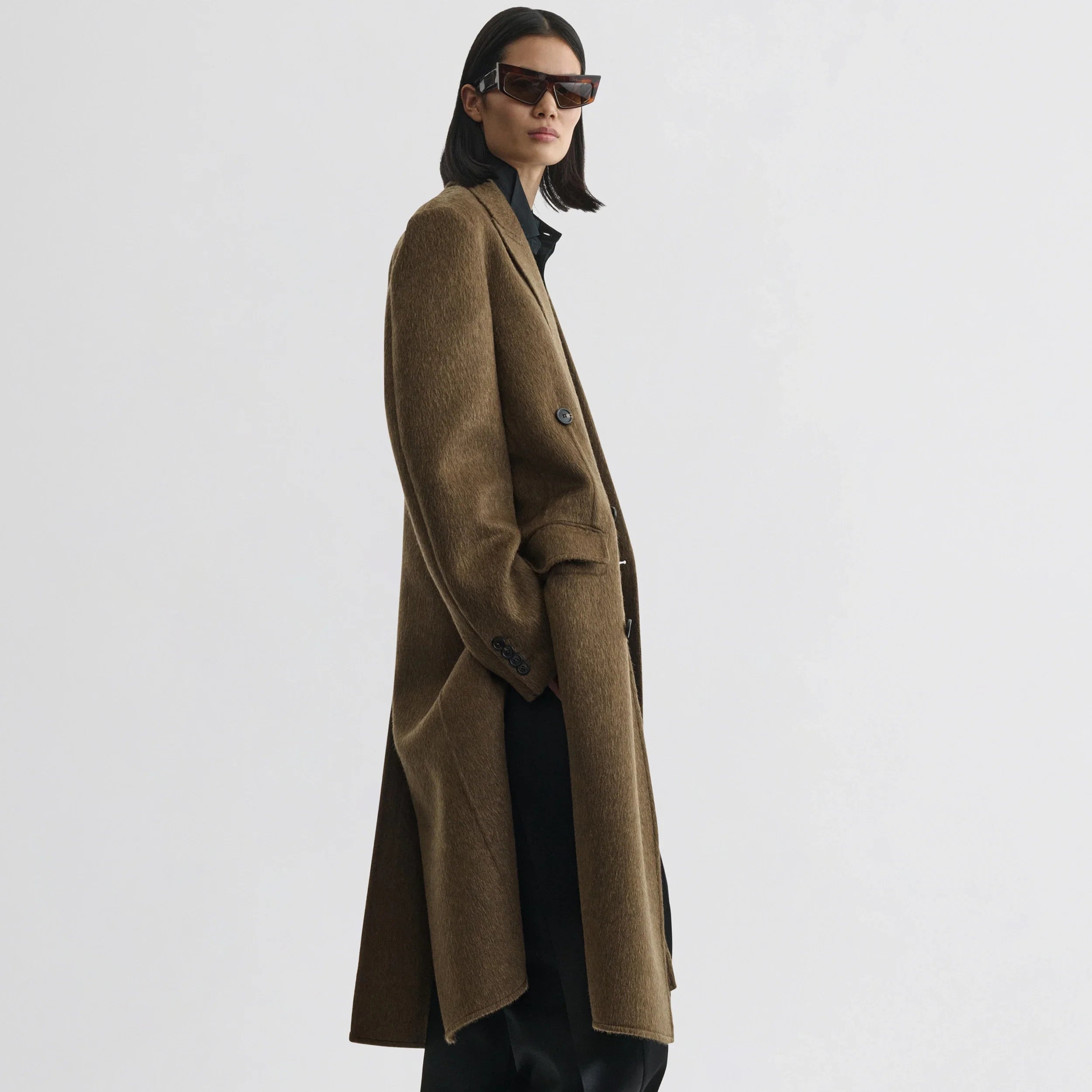 Man’s coat in bronze khaki wool mohair. Double breasted with horn buttons. The coat has inverted sleeves, a lightly structured shoulder, dropped contour waist and slits towards the front. Partially lined, the double face construction ensures the coat is both warm and lightweight. The brushed fabric has a slight sheen.