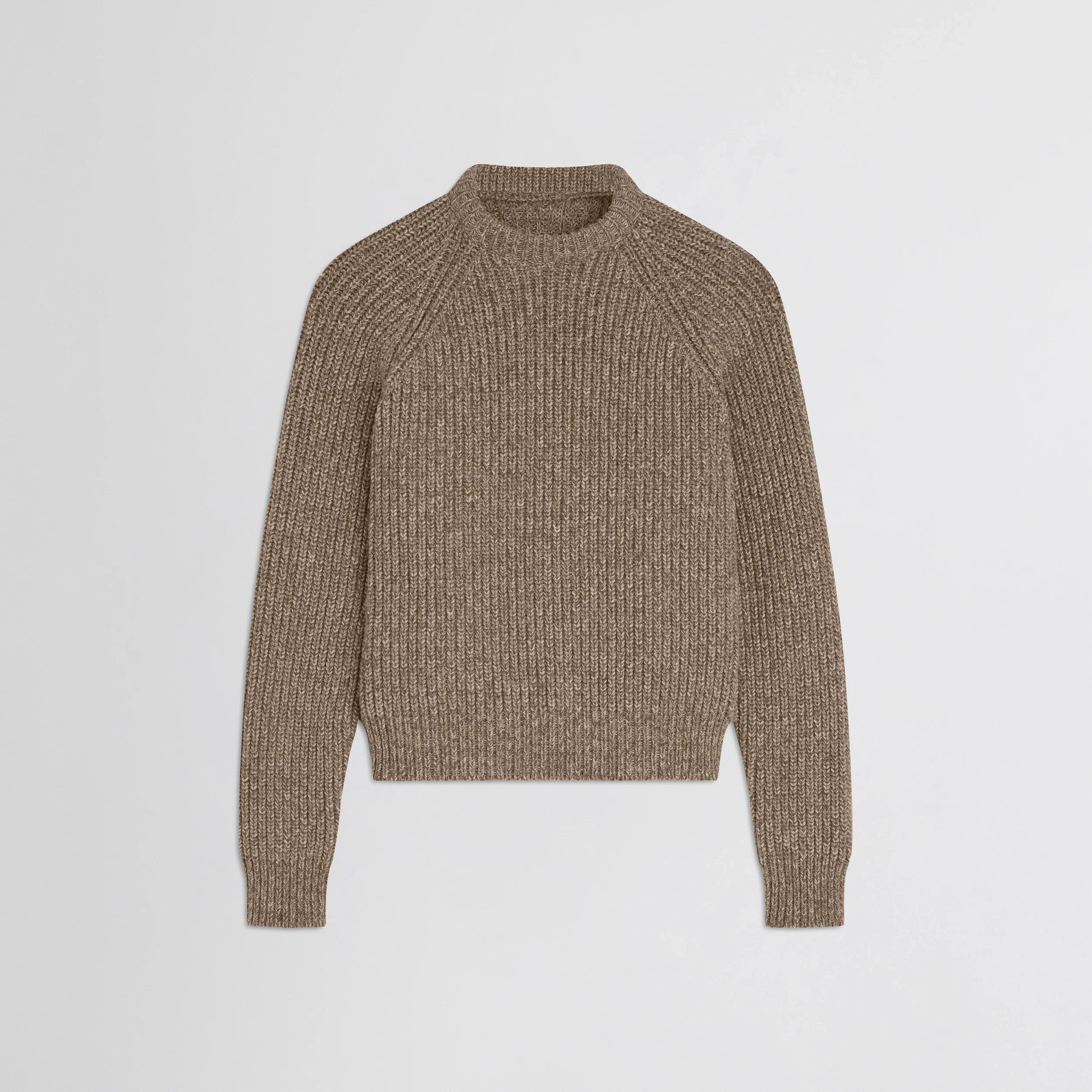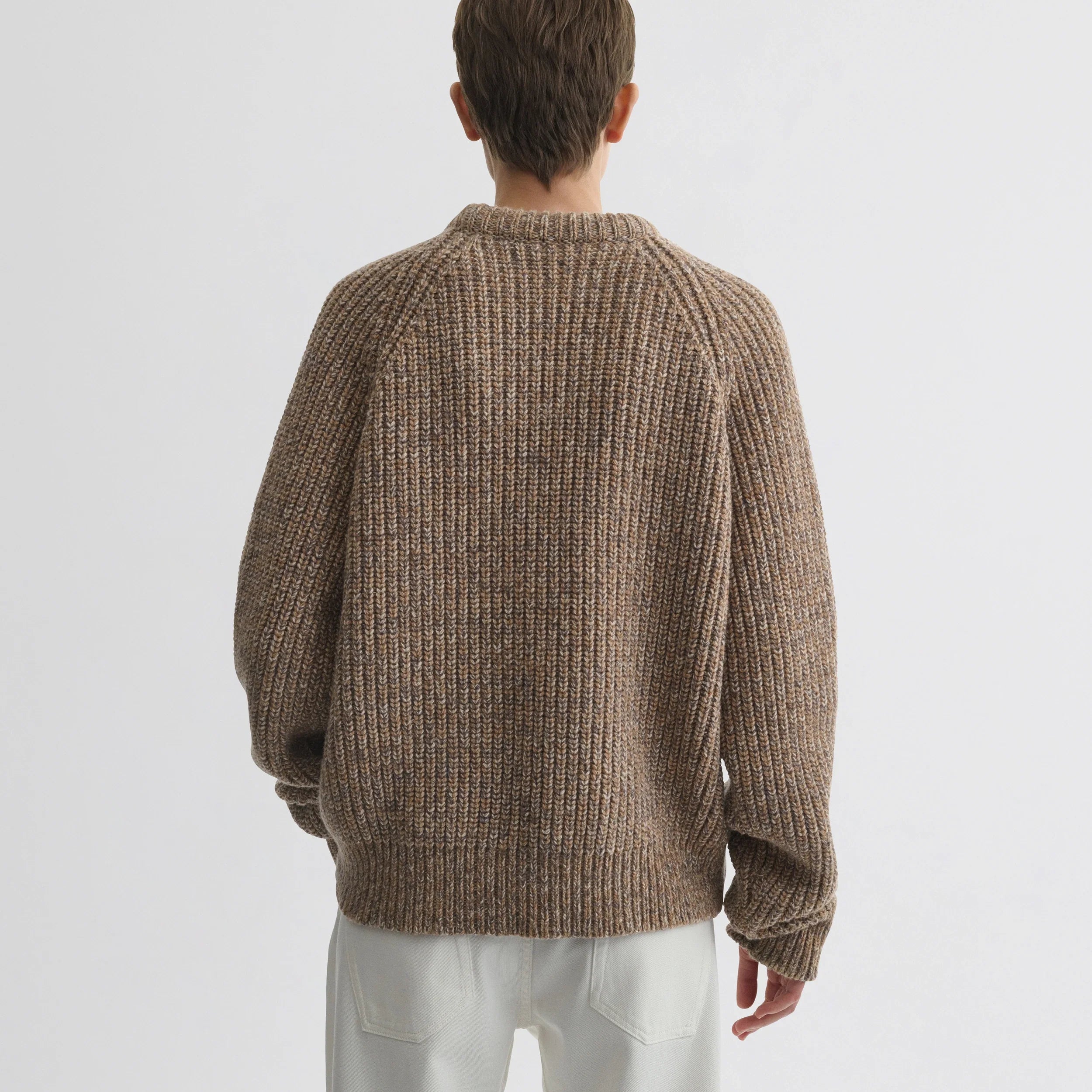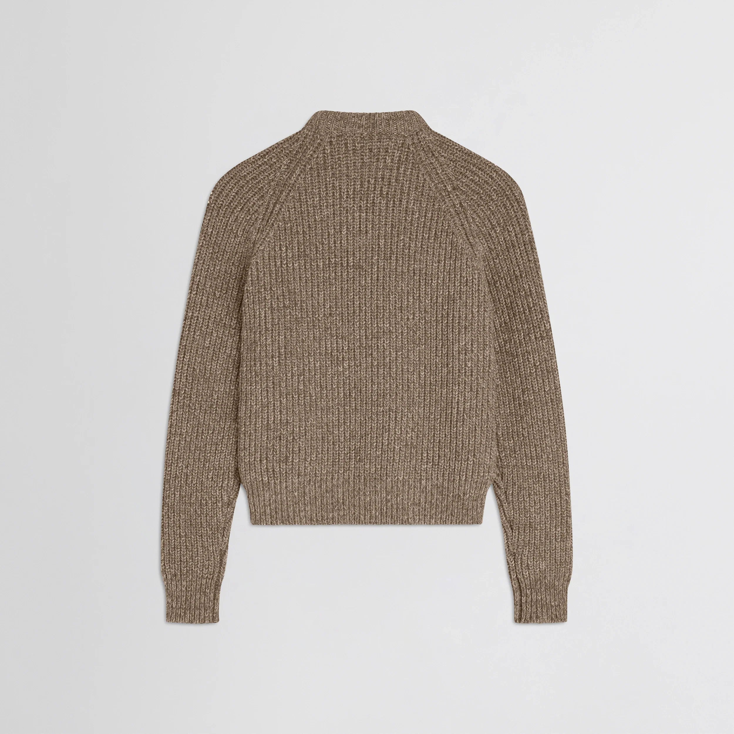 Jumper in camel wool cashmere. Chunky, graphic mouline knit constructed with yarns in contrasting colours for a textural effect. Triple rolled tubular collar.