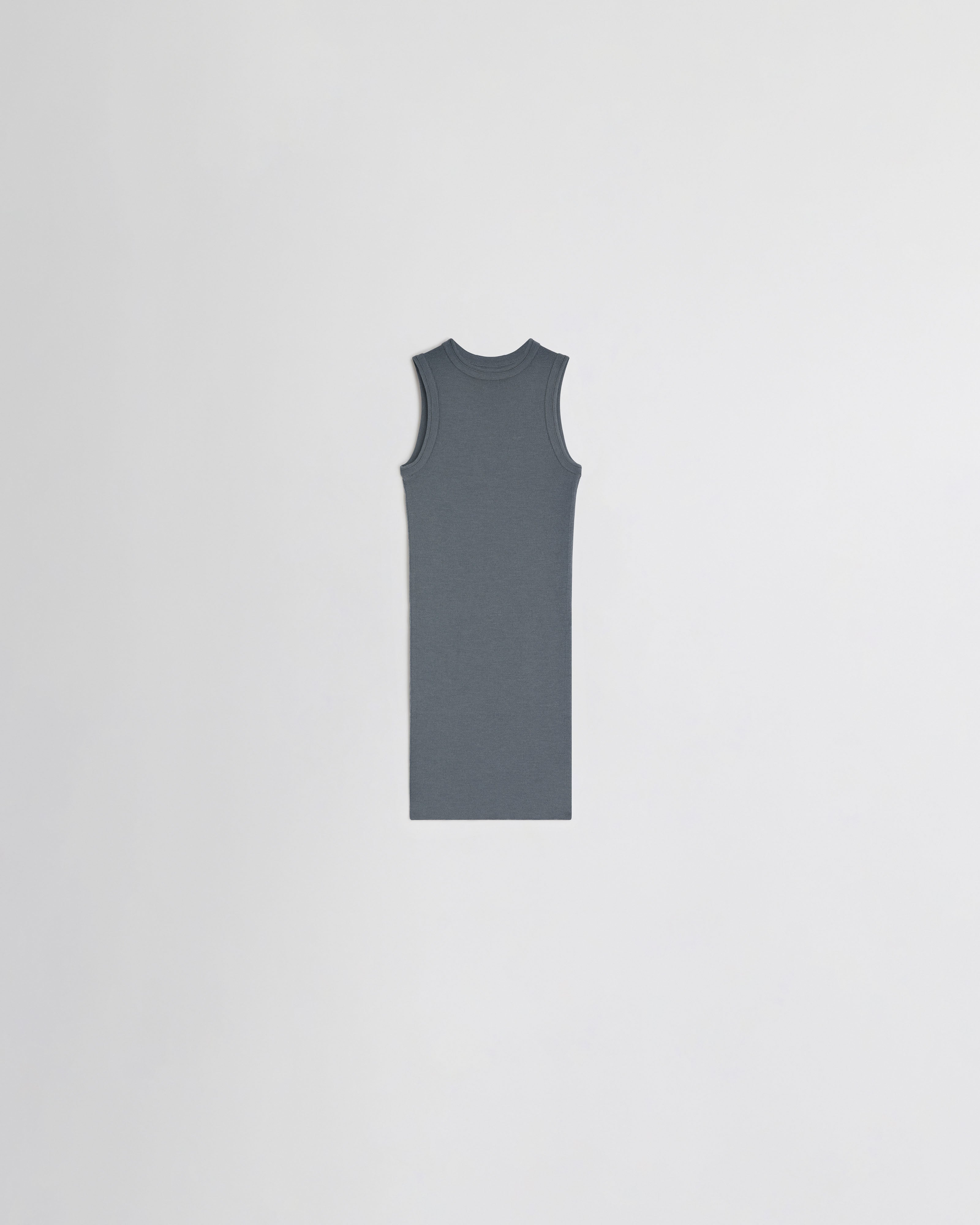 Fitted racer-front tank in grey ribbed merino wool. Cut for an elongated line, the lightweight, semi-sheer top has doubled rib trims with raised stitch detailing at the neck and shoulders.