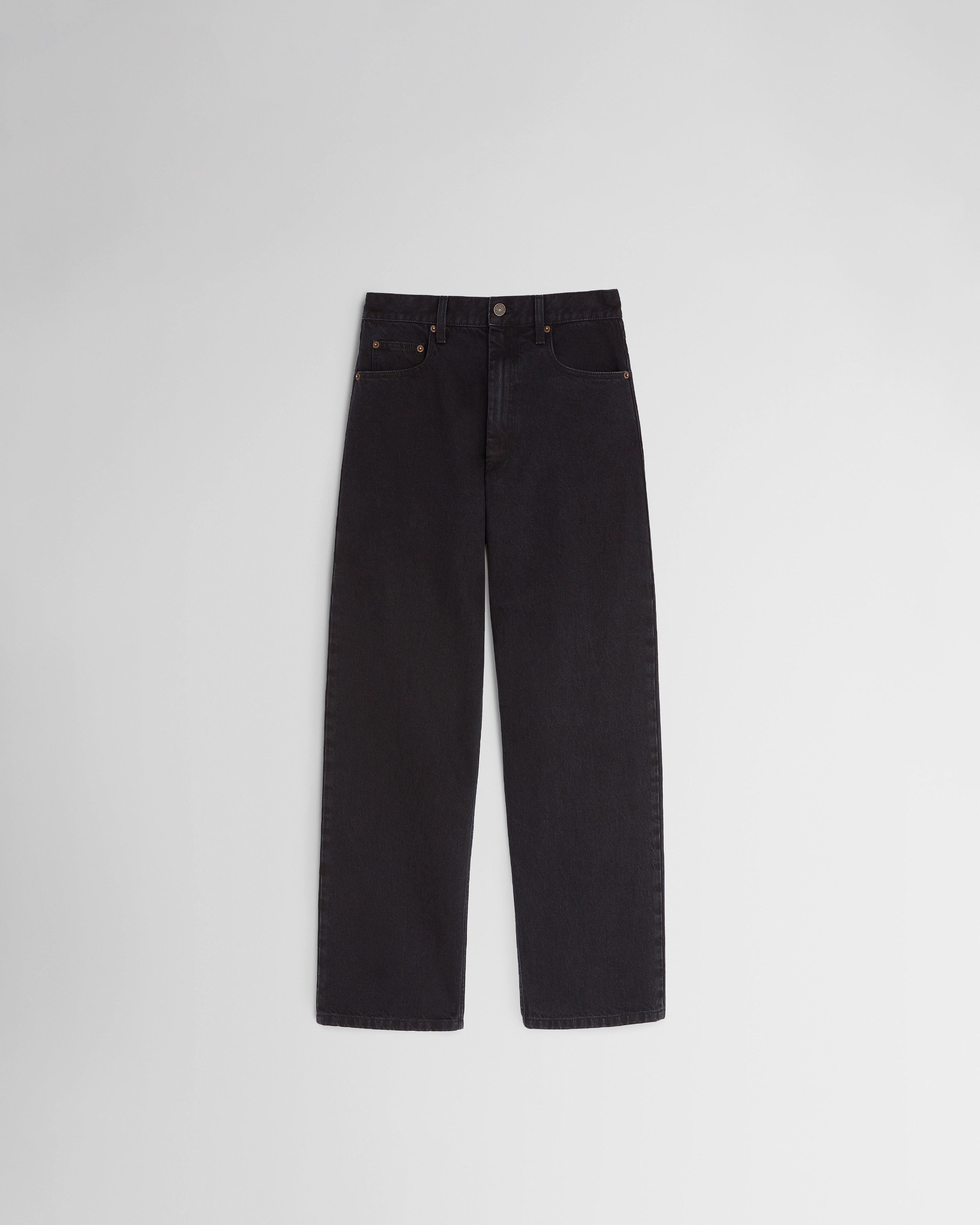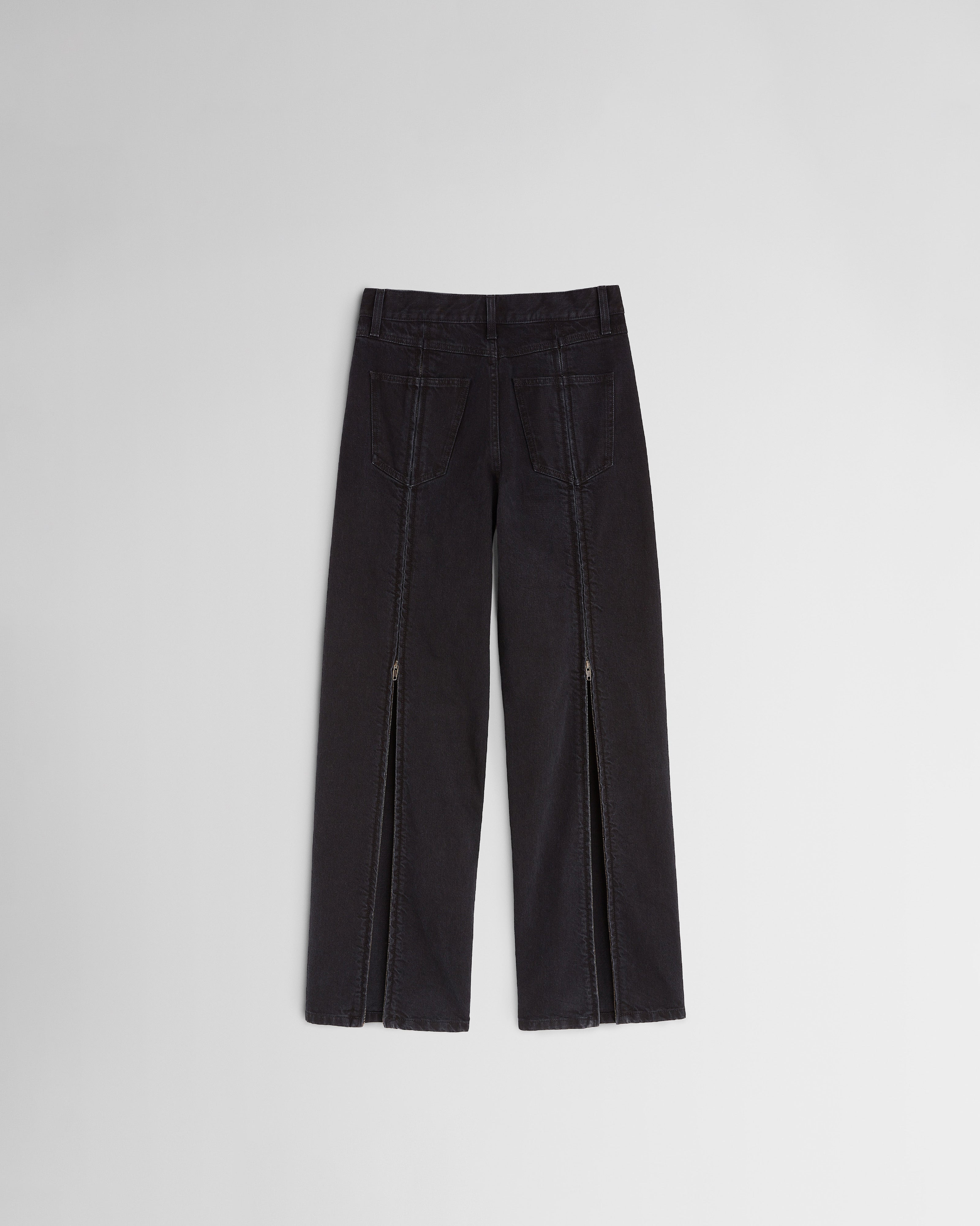 Zip-back, waisted black jeans. Five-pocket style with a relaxed fit. Zips run the length of the jeans from waistband to hem, when unzipped the trousers have a flared line. The wash creates an intentional laundered look along the zips and seams.